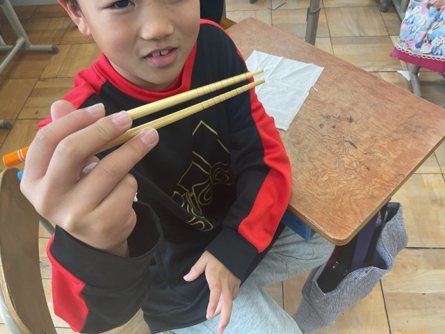 栄養教諭の山田先生にクラス毎に「お箸の正しい持ち方」について教えてもらいました。魔法の紙やお箸を使って分かりやすく練習できました。
