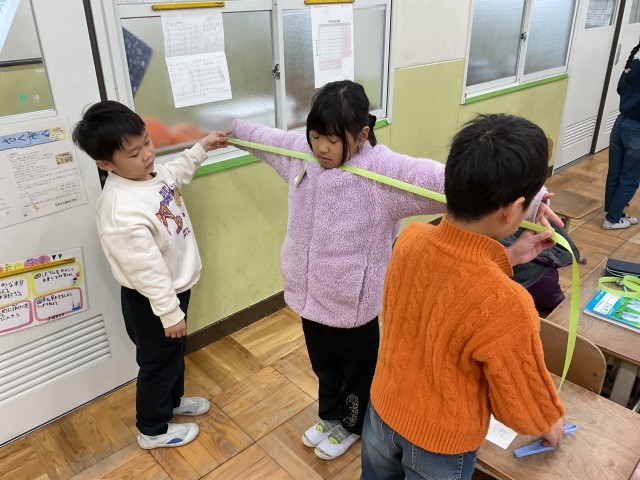 算数の学習で、両手を広げた長さを紙テープで写し取り、ものさしで長さを調べました。