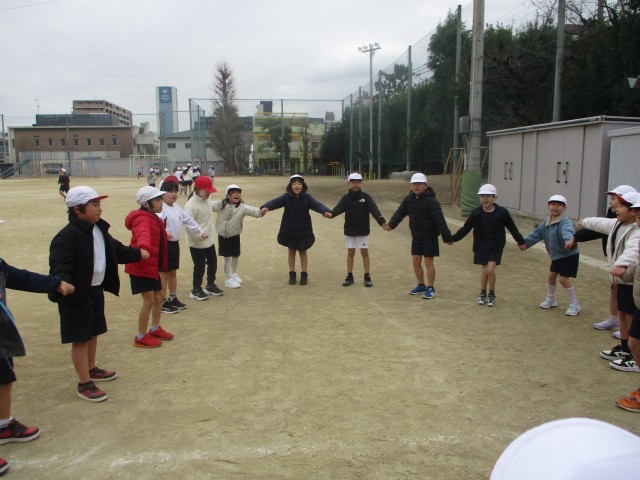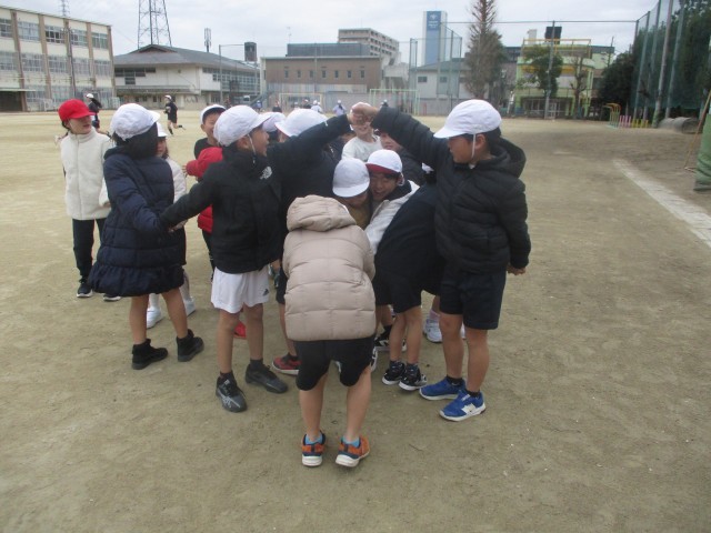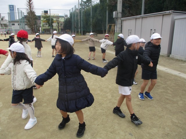 教室では、せまいので体育の学習の時に運動場で挑戦です。
