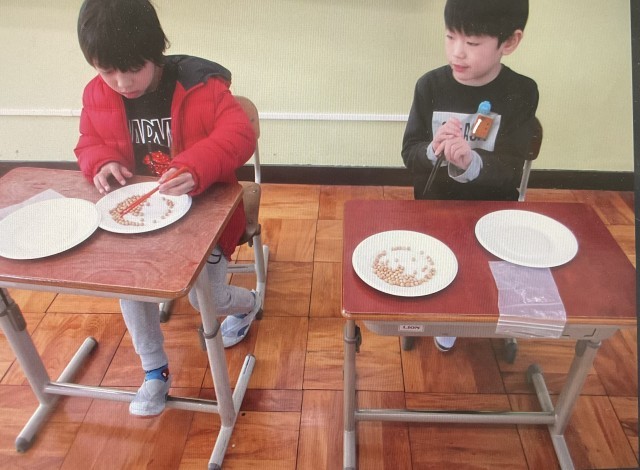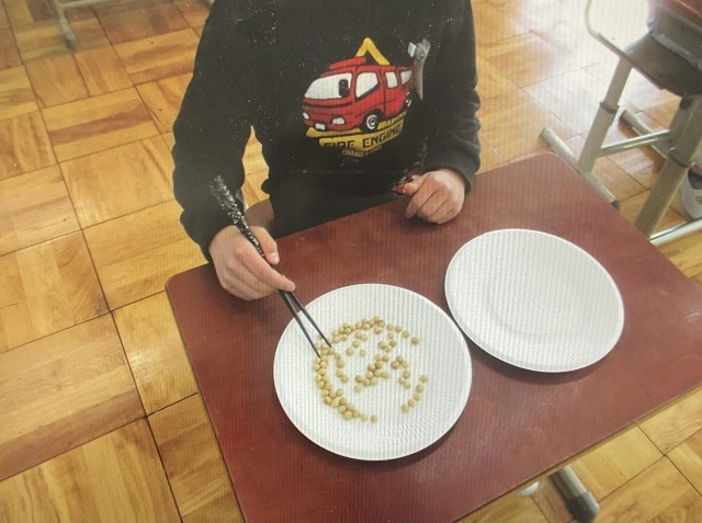 とてもつまみにくい豆、、、。苦戦しながらも、箸の正しい持ち方を意識して取り組むことができました。