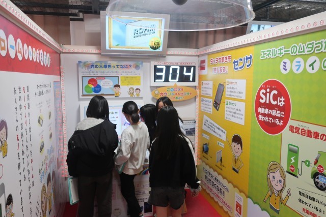 工房学習で教えていただいた、ローム株式会社のブース。光の三原色に興味津々でした。