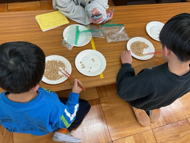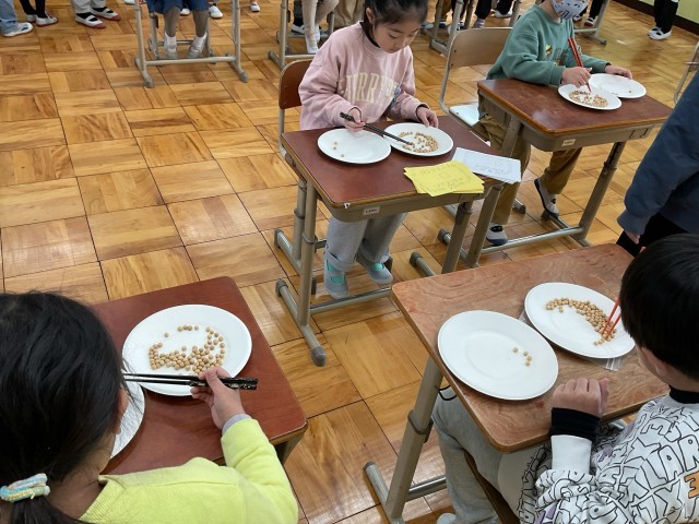 中間休みに、給食委員会主催の豆つかみ大会がありました。ツルツル滑る豆に苦戦しつつも、箸を使って豆を隣の皿へ移すことができていました。お箸が上手に持てているねとお褒めの言葉をいただきました!記録の用紙は、大会が終わり次第持ち帰りますので、ぜひご覧ください。