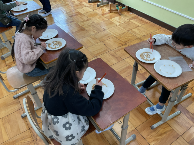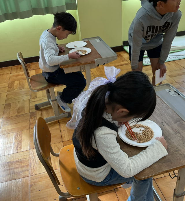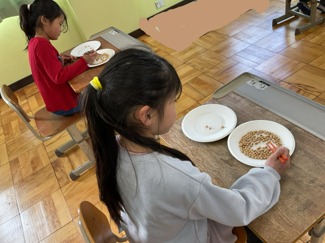お箸の持ち方に気を付けて、慎重にお豆をお皿に移すことができました。