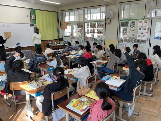 今日の外国語は、ALTのジェディダ先生が教室に来て外国語を教えてもらいました。絵本を読んでもらったりクイズを出してもらったりして盛り上がりながら外国語を楽しみました。