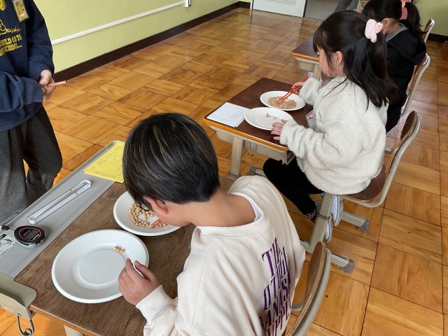 中間休みに給食委員会による豆つかみ大会が開催されました。正しいお箸の持ち方を広めるための考えられたものでした。豆をつかむのは、なかなか難しかったです。