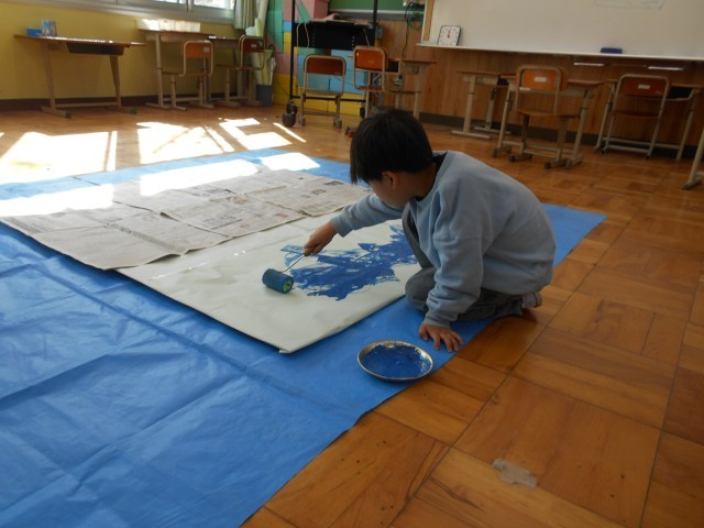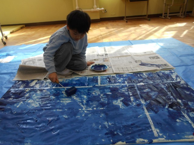 アートフェスティバルの「土台作り」をローラーでしました。「水が多い方がやりやすいな。」「白がないようにぬろっと。」「端は筆でやる方がやりやすいで。」等、いろんなことに気づき、つぶやきながら一生懸命取り組んでいました。