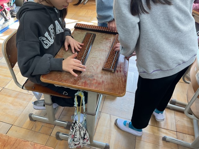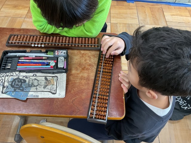 算数は、テストの単元が全て終わり最後の単元である「そろばん」に入っています。昔の道具であるそろばんの使い方を知ることで、新しい計算の仕方を学んでいます。