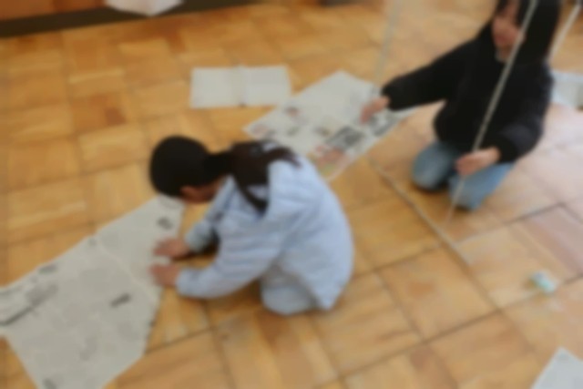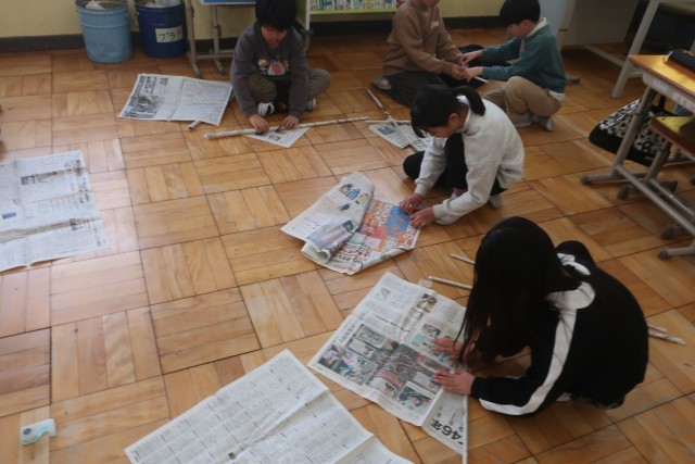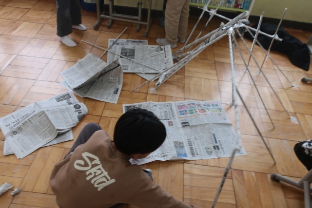 新聞紙を細く丸めて棒にし、組み立てました。