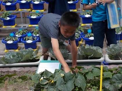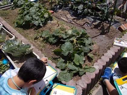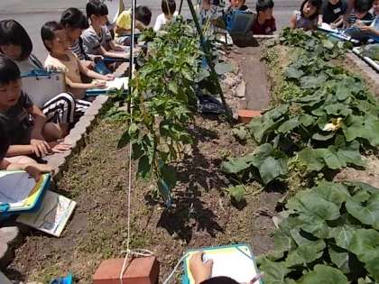 賀茂なす,万願寺とうがらし,鹿ヶ谷かぼちゃの成長を観察しました。子どもたちは野菜を見たとたん,「わあ!大きくなってる!」と感動してました。