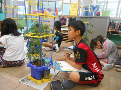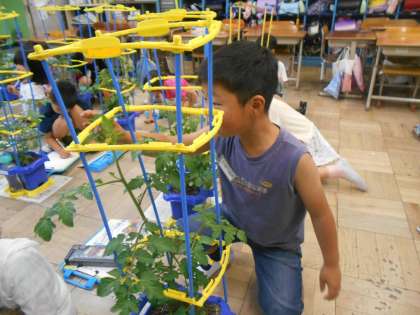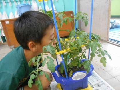 毎日水やりをしているトマトの観察をしました。においをかいだり,実の数を数えてみたり・・・。