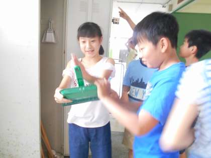 身近なところに線対称な図形があるか調べてみました。水道の蛇口やほうき,ちりとりなど自分たちの周りには意外と線対称な図形があるのですね。