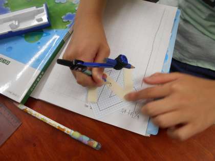 コンパスで押さえながら,図形を回転させています。180度回転させたときに,重なる図形が「点対称な図形」といえるのですね!
