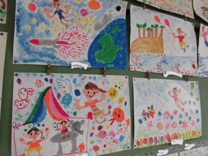 「とんでみたいな いきたいな」楽しそうなサーカスの上を飛んだり・・・・きれいなちょうちょを追いかけて花畑の上を飛んだり・・・・思い思いに描きました。