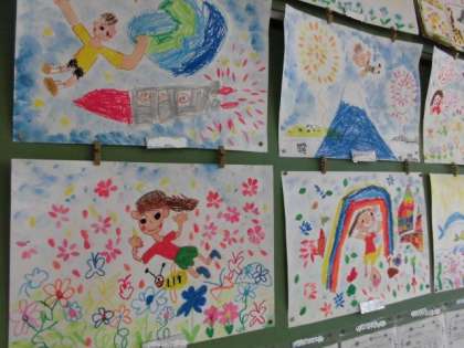 「とんでみたいな いきたいな」みつばちと一緒に飛んでいるところや,きれいな虹を見つけてとんでいるところ,宇宙に飛び出したところ,富士山の上を飛んでいるところを描いた作品もあります。