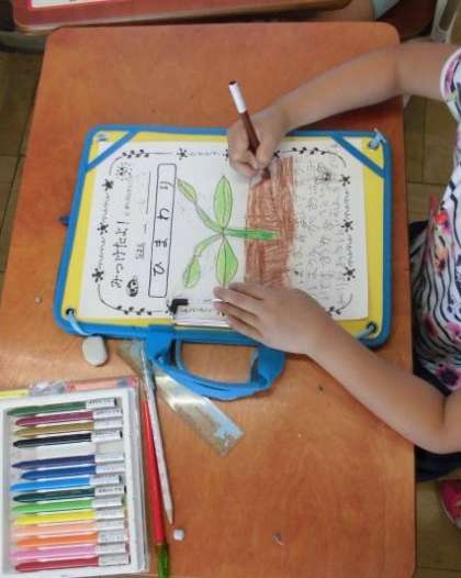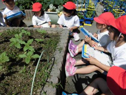 花壇のひまわりが大きくなってきました。葉が6まいくらい出ているのもあります。よく見て発見したことをみつけたよカードにかきました。