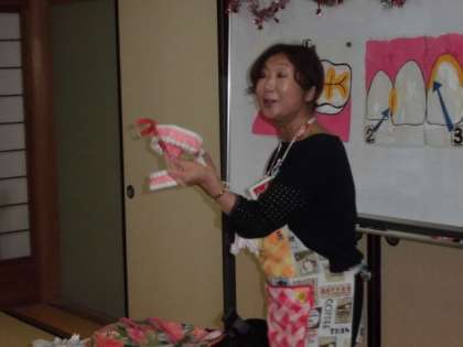模型を使って分かりやすく歯の磨き方を教えてくださいました。歯ブラシを持って実際にやってみます。