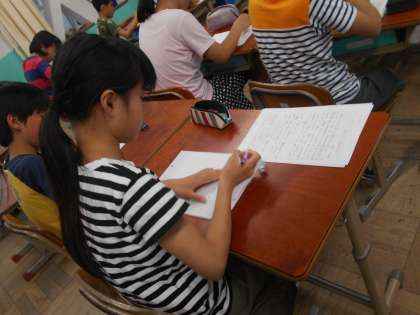社会を明るくするためには何ができるだろうか。というテーマで作文を書きました。あいさつやゴミ拾い,思いやりをもつことなど,みんなそれぞれに思いがあるようです。