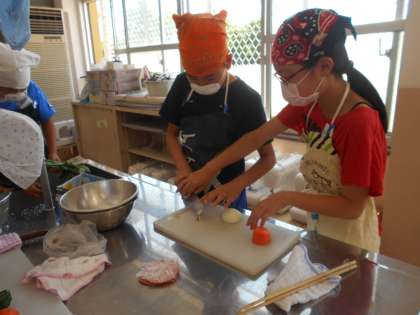 「手は猫の手にして切るよ。」と友だち同士で確認していました。安全第一でね!