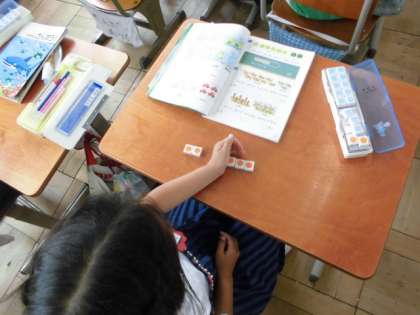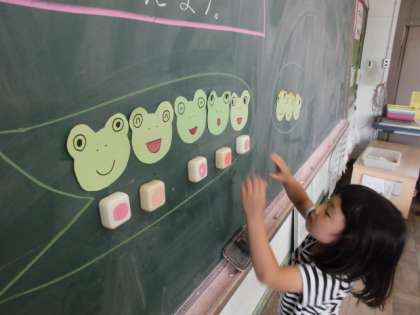 今日は,「ちがいは いくつ」の問題にチャレンジです。さし絵をよく見て,数図ブロックを動かして,「いくつ おおいか。」を考えました。