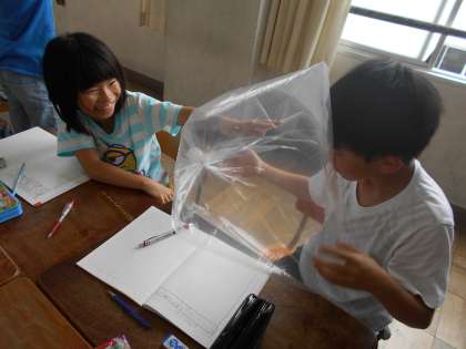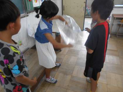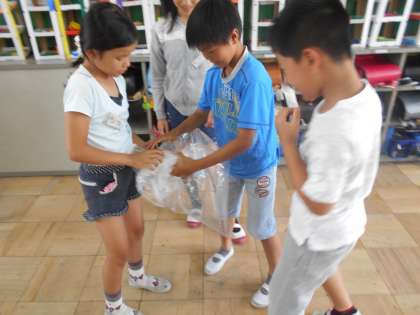 今日から理科で新しい学習「とじこめた空気や水」が始まりました。最初の時間は,空気を袋にとじこめて,さわったりおしたり抱きしめたり・・・どんな手ごたえがするかな?とじこめた空気について気付いたことを話し合いました。