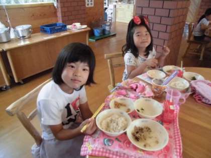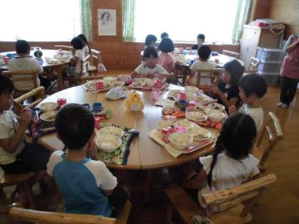 ランチルームで楽しくいただきます。日直さんがランチルームのお楽しみサイコロを転がすと,「のこさず食べよう」という今日のめあてが出てきました。