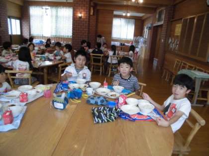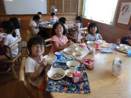 ランチルームはまるでレストランのようです。嬉しそうな顔が見えます。よく噛んで味わって食べているようです。