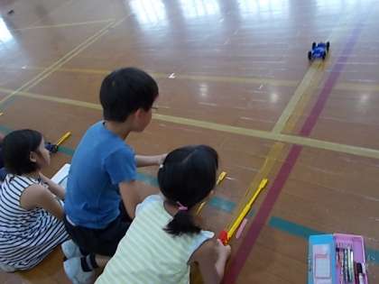 今日は,ゴムののばし方をかえると,ものの動きはどのように変わるかについて,実験をしました。子どもたちは,「うわあ!すごく進んだ!」「さっきよりも遠くまで動いた!」など,楽しく実験していました。