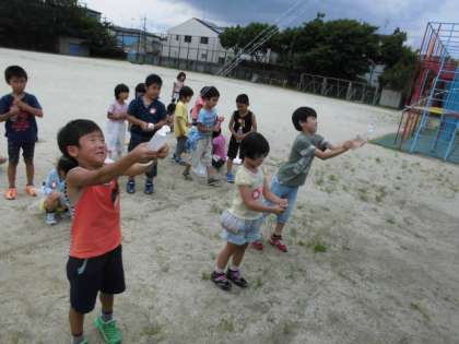 何回もやっているうちに,こつが分かってうまく水をとばせるようになったみたいです。友だちと一緒に楽しんでいました。