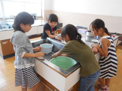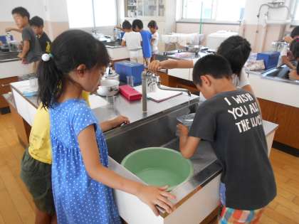 洗い桶,ごはん茶碗,ボウルなどに,水がどれくらい入るか予想して,実際に実験をしてみました。予想以上にたくさん水が入ったね。