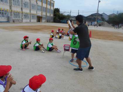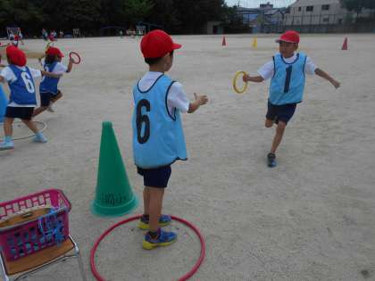 体育で「リレーあそび」をしました。バトンを落とさないように友だちにわたせるかな。チームのみんなで力を合わせてがんばって走りました。
