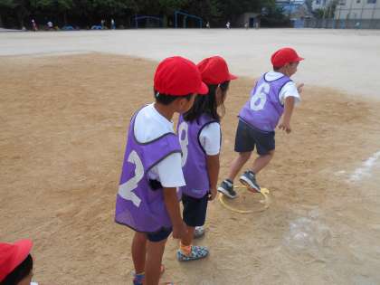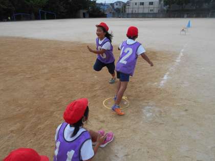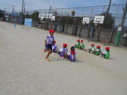 「おきかえリレー」でいろいろなチームと対戦しています。スピードにのって思いっきり走っています。