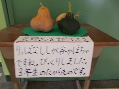 なかなか実のらなかった「ししがたにかぼちゃ」が.りっぱに実りました。