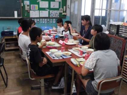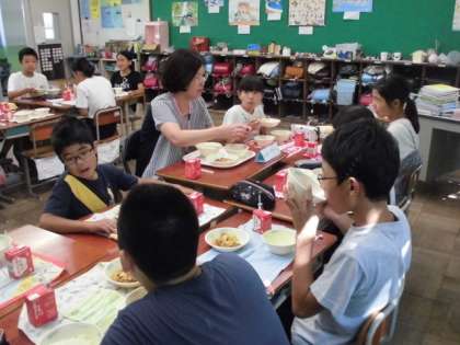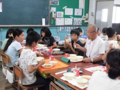 6年生の教室で子どもたちと一緒に給食を食べていただきました。それぞれグループに入っていただき,和やかな雰囲気の給食時間になりました。「とてもおいしかったです」「よい子どもたちでした」と感想を言っていただきました。