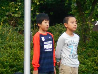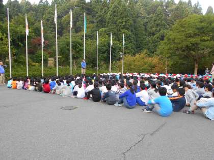 宿泊している学校が集合して,「朝の集い」です。その中で最初に川岡小の学校紹介をしました。よく聞こえる声でしっかりと学校紹介ができました。