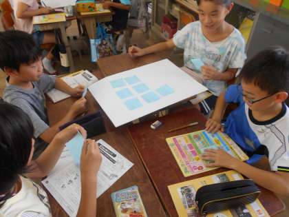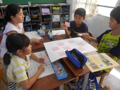 夏休みのエコライフの取組をふり返って,できたことやむずかしかったことを班ごとに話し合い,これから頑張っていきたいエコライフのためのチャレンジ目標を決めました。