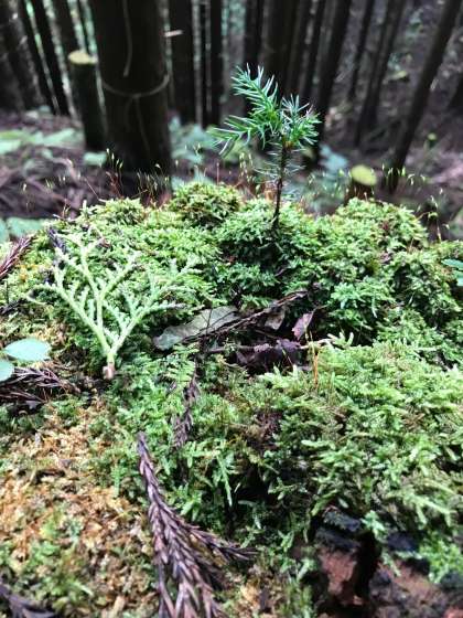 登山の途中では杉の木と、ヒノキの木の赤ちゃんを発見しました。どっちがどっちかわかるかな?