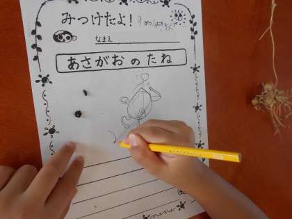 自分の植木鉢のあさがおの種取りをしました。花がたくさん咲いた後に,種もたくさんできていました。よく見て「みつけたよカード」にかきました。