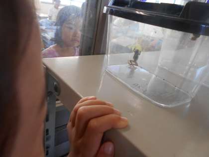 中庭のあさがおの植木鉢のそばに,アマガエルが2匹いました。学校の中には,いろんな生き物がいますね。観察したら,すぐに元の場所にもどします。