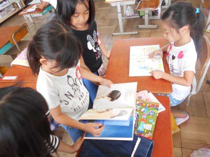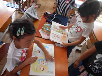 図書室で本を借りるのをとても楽しみにしています。教室にもどると,すぐに読んでいました。