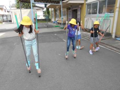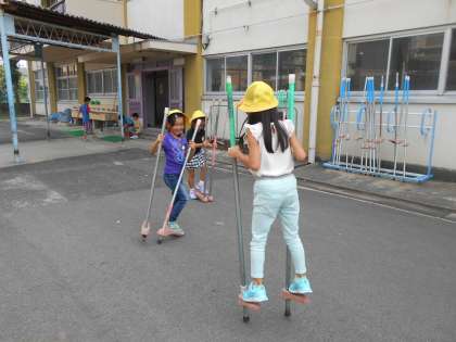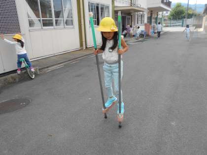 中庭で竹馬で遊んでいました。いろんな遊具で遊ぶと楽しいですね。