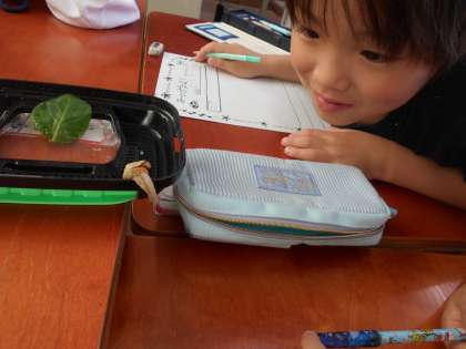 みんなでお世話をしているカタツムリをよく見て,「みつけたよカード」にかきました。カタツムリは思ったよりよく動いて,見ている間に,飼育ケースのふたのまわりを2周半も移動したので,「こんなにうごくんや!」とびっくりしていました。