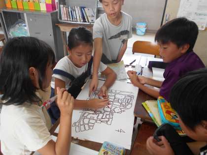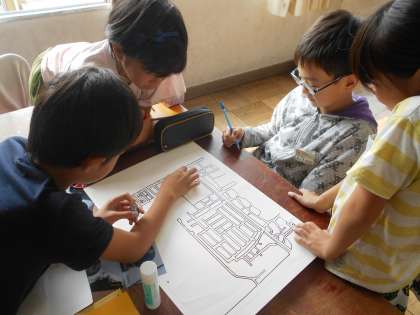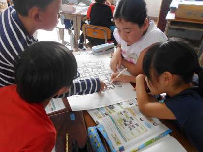 社会科「事故や事件をふせぐ」の学習で,校区の安全マップを作りました。危険だと思う場所やその理由をグループごとに地図に書き込んでいきました。車の多いところや夜になると暗くなる道があることがわかりました。