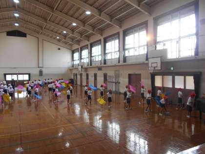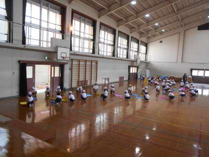 体育館で,移動の仕方を確認しました。今回は,3回,隊形が変わります。
