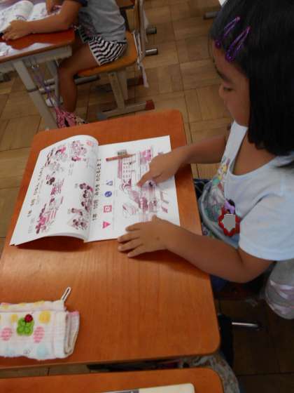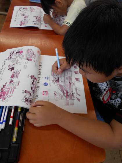「みちをわたるとき」に気をつけることを 安全ノートの挿し絵を見ながら考えました。登下校の時や放課後など,実際に道を渡ったり歩いたりする時に安全に気をつけて行動できるようにしたいです。