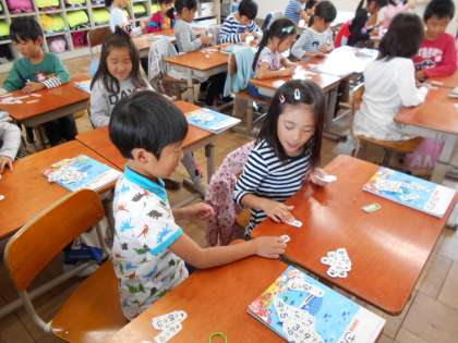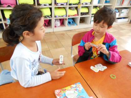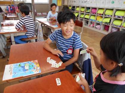 二人組で,「たしざん(2)」の計算カードを使って,カードゲームをしました。はじめに「こたえは いくつ」ゲーム,次に「おおきさくらべ」ゲーム,どちらのゲームも楽しんでいました。「ああ,楽しかった。」「計算が速くできた。」と大満足の様子でした。