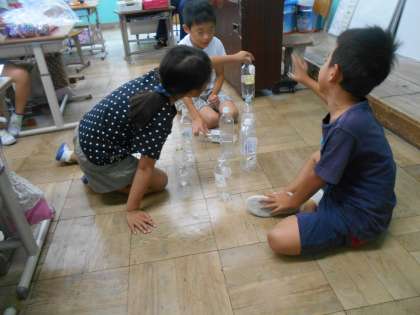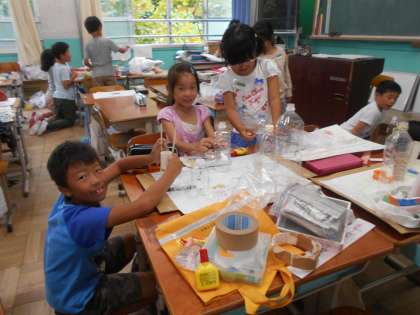 ペットボトルなどを使って,遊ぶものを作っています。もうすぐ完成するかな?早く遊びたいね。