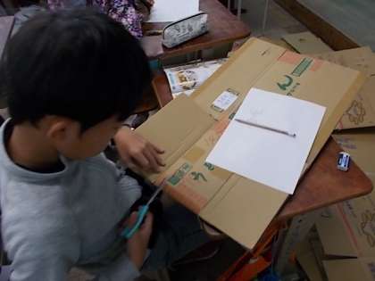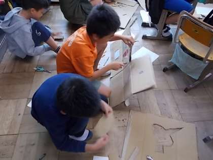 今日は,段ボールを切って,つなぎ合わせて作品を作りました。みんなは,切るのがなかなか難しそうでしたが,楽しそうに作品作りをしていました。
