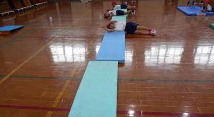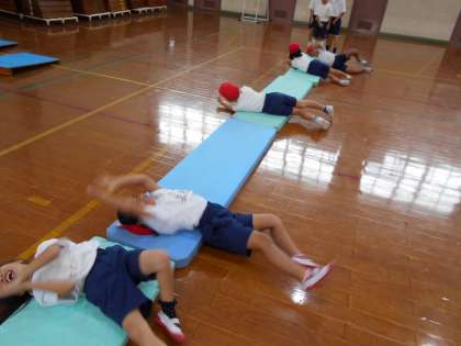 「マットあそび」の2回目です。「体ならし」,「ねらい1」をした後,「ねらい2」の場づくりをして,連続技に挑戦しました。