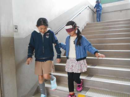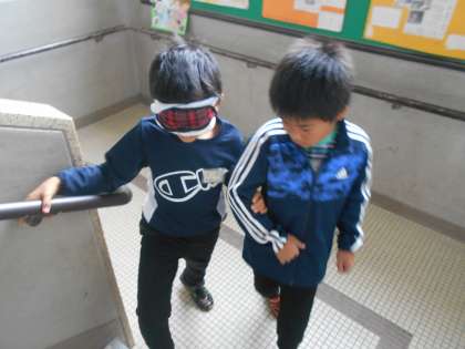 今日は3組がアイマスク体験をしました。目が不自由な方の立場や,手引きをするときのポイントを学びました。