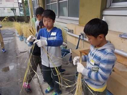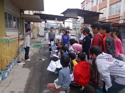 稲刈りの仕方を教えてもらい,